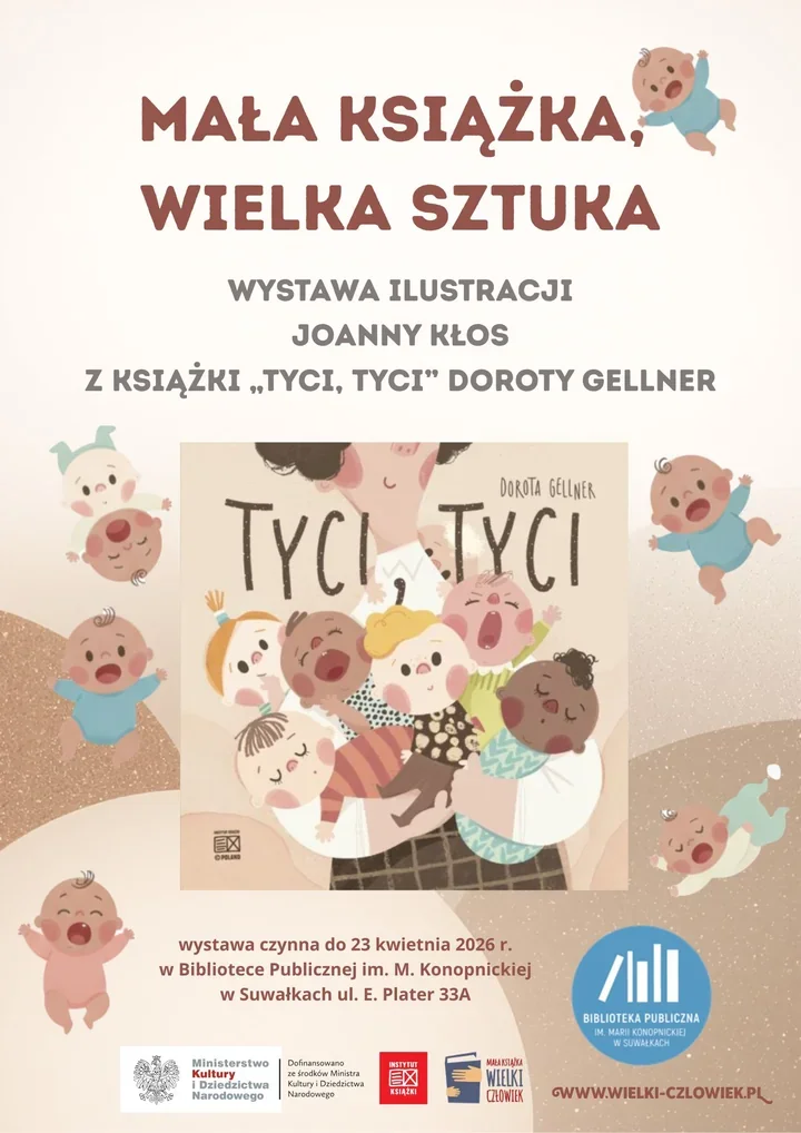 W suwalskiej bibliotece można dziś podejrzeć książkę, która najpierw trafia do noworodków, a dopiero potem - trochę przewrotnie - zaprasza do siebie starsze dzieci. Wystawa ilustracji Joanny Kłos do „Tyci, tyci” Doroty Gellner zamienia Bibliotekę Publiczną im. Marii Konopnickiej w Suwałkach w miejsce, gdzie mała forma robi naprawdę duże wrażenie 📚