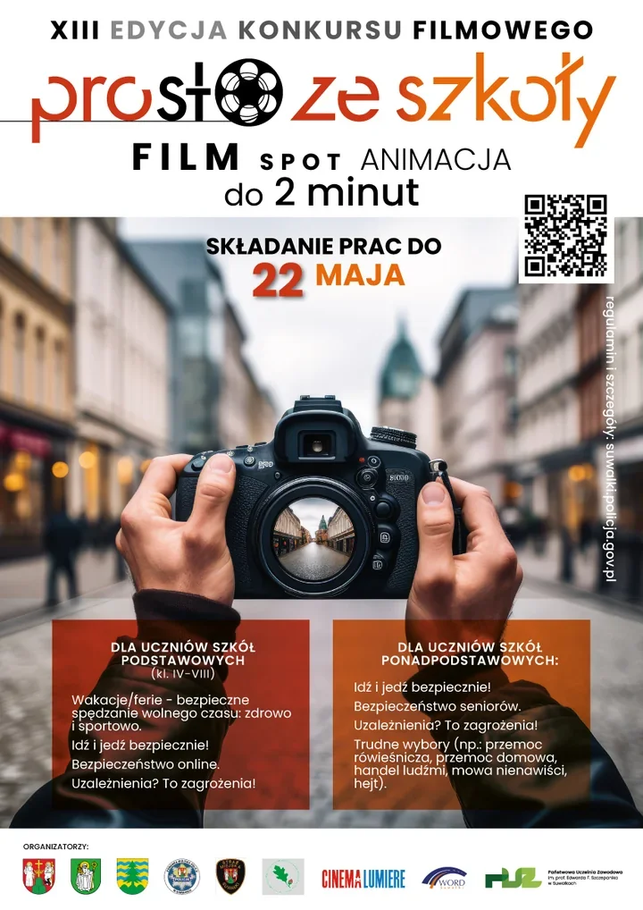 Komenda Miejska Policji w Suwałkach uruchomiła XIII edycję konkursu filmowego „Prosto ze szkoły”. Uczniowie mają przygotować krótki materiał, który promuje zdrowy styl życia bez środków uzależniających albo bezpieczne zachowania na co dzień. Na zgłoszenia Policja czeka do 22 maja 2026 roku.